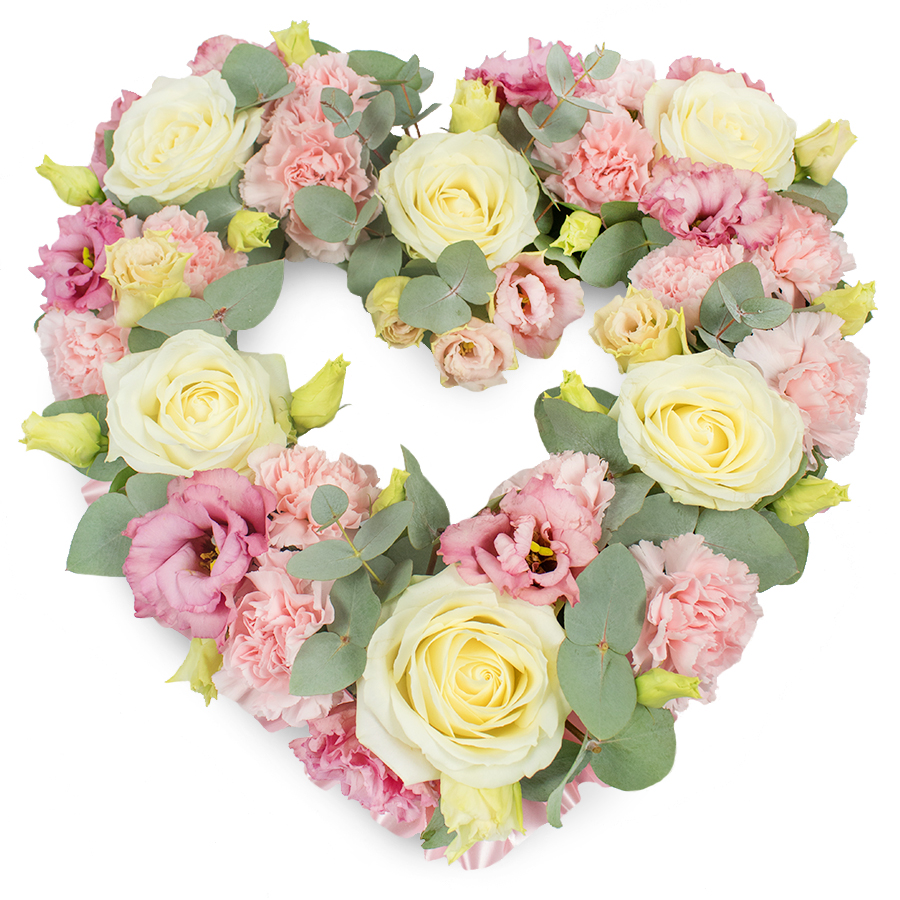 Embrace the art of remembrance with our beautifully arranged tribute bouquet. This luxurious arrangement combines the timeless elegance of white roses, the gentle beauty of pink carnations, the soft charm of pink lisianthus, and the invigorating touch of eucalyptus leaves. Every flower is carefully hand-picked to ensure remarkable freshness and lasting vibrancy. Its unique open-heart design evokes a warm, heartfelt message, making it an ideal gift for honoring cherished memories.